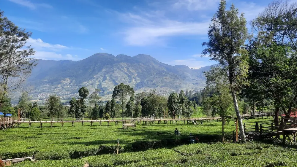 A wide stretch of green fields gives visitors beautiful views. This tea plantation is more than 1,300 meters above sea level on the slopes of Mount Sindoro. You can find several interesting places here, like a wooden bridge that runs through the tea fields.