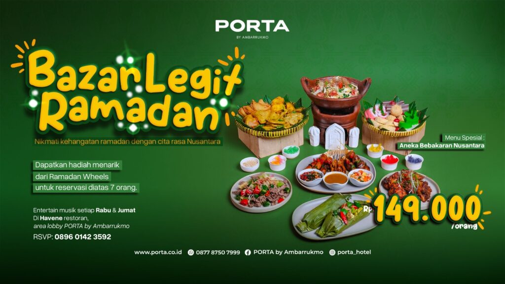 PORTA by Ambarrukmo invites you to enjoy the ‘Bazaar Legit Ramadan, Sajian Rasa Nusantara’ iftar package at Havene restaurant for IDR 149,000 per person. What makes PORTA special is its wide selection of traditional Indonesian dishes. You can choose from Satay, Roasted Lamb, Tengkleng, Pepes Ikan, Assorted Soups, and more. For dessert, try their Es Campur, Kolak, and a variety of Indonesian snacks. On weekends, PORTA by Ambarrukmo also hosts a Ramadan pop-up market, and you can join in lucky wheel games. Interested? Book your spot today!